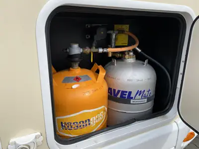 Køkkenet er udstyret med et kompakt køleskab, der opbevarer mad og drikkevarer på de rigtige temperaturer, mens du er på vejen. Ofte har køleskabet en lille fryser til fx is og frostvarer.